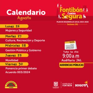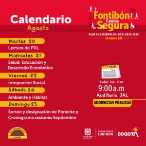 A partir de este martes, 20 de agosto, los ediles y edilesas de la Junta Administradora Local estarán discutiendo el Plan de Desarrollo Local 2025-2028 que regirá en Fontibón. Tendrán 10 audiencias públicas a las que todos los ciudadanos podrán asistir desde las 9:00 a.m.