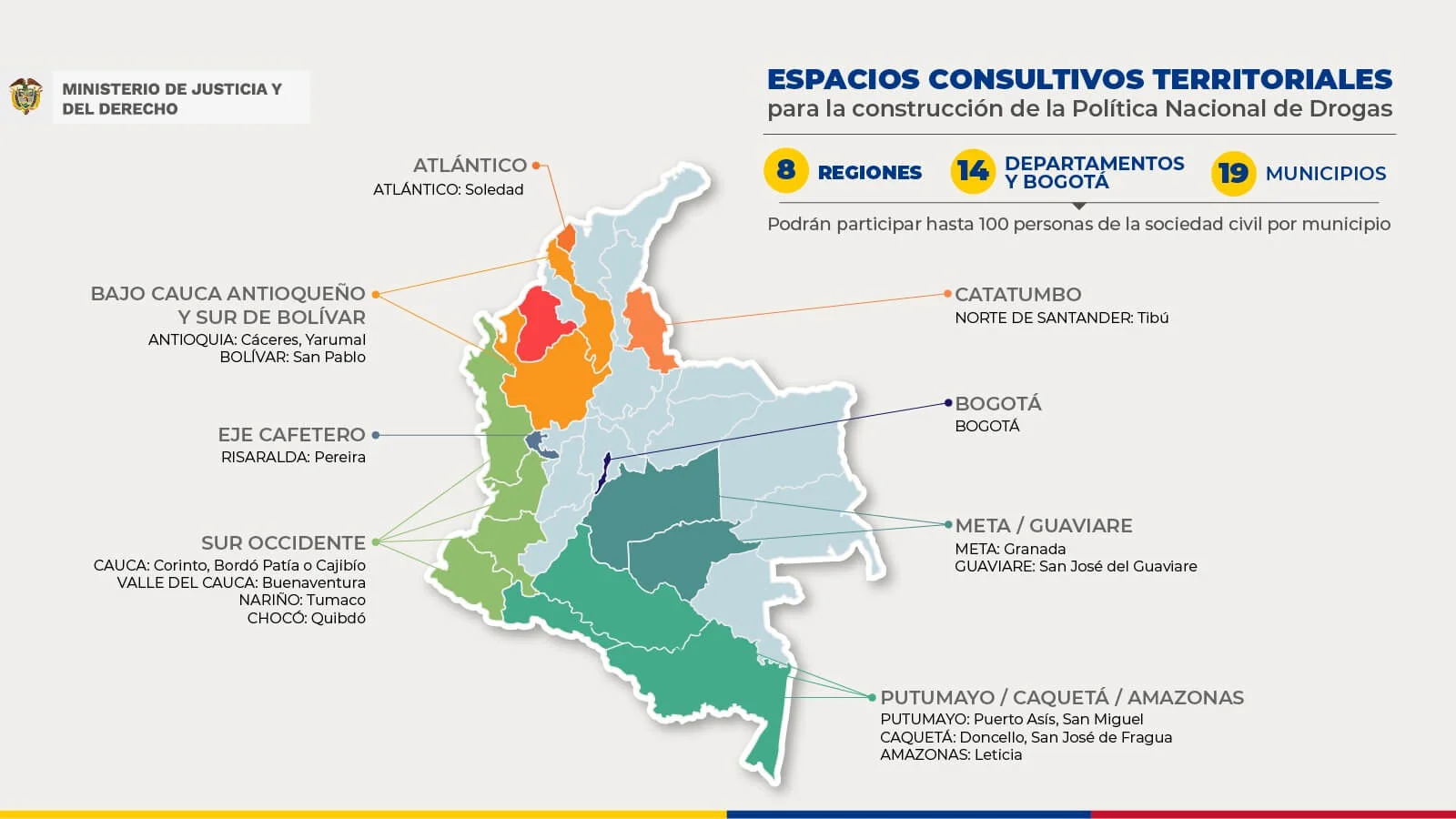 En este escenario histórico, representantes de las organizaciones sociales de los departamentos de Cauca, Nariño, Caquetá, Valle del Cauca, Putumayo, Norte de Santander y Risaralda, en compañía de entidades del Gobierno nacional y de la cooperación internacional, definieron los 19 municipios donde se realizarán, a partir del mes de febrero, los Espacios Consultivos Territoriales previstos para las ocho regiones priorizadas, que corresponden a 14 departamentos y Bogotá.